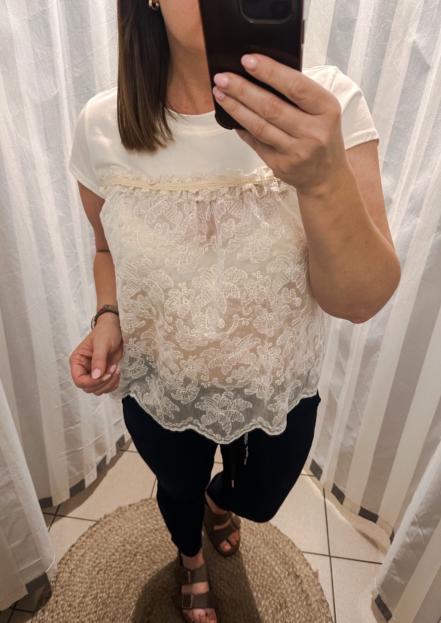 Kobieca bluzka damska z okrągłym dekoltem z łączonych materiałów – bawełnianej góry i haftowanego, luźnego dołu. Uniwersalny charakter bluzki sprawia, że jest idealną propozycją do pracy, na co dzień czy na wakacyjny wyjazd.