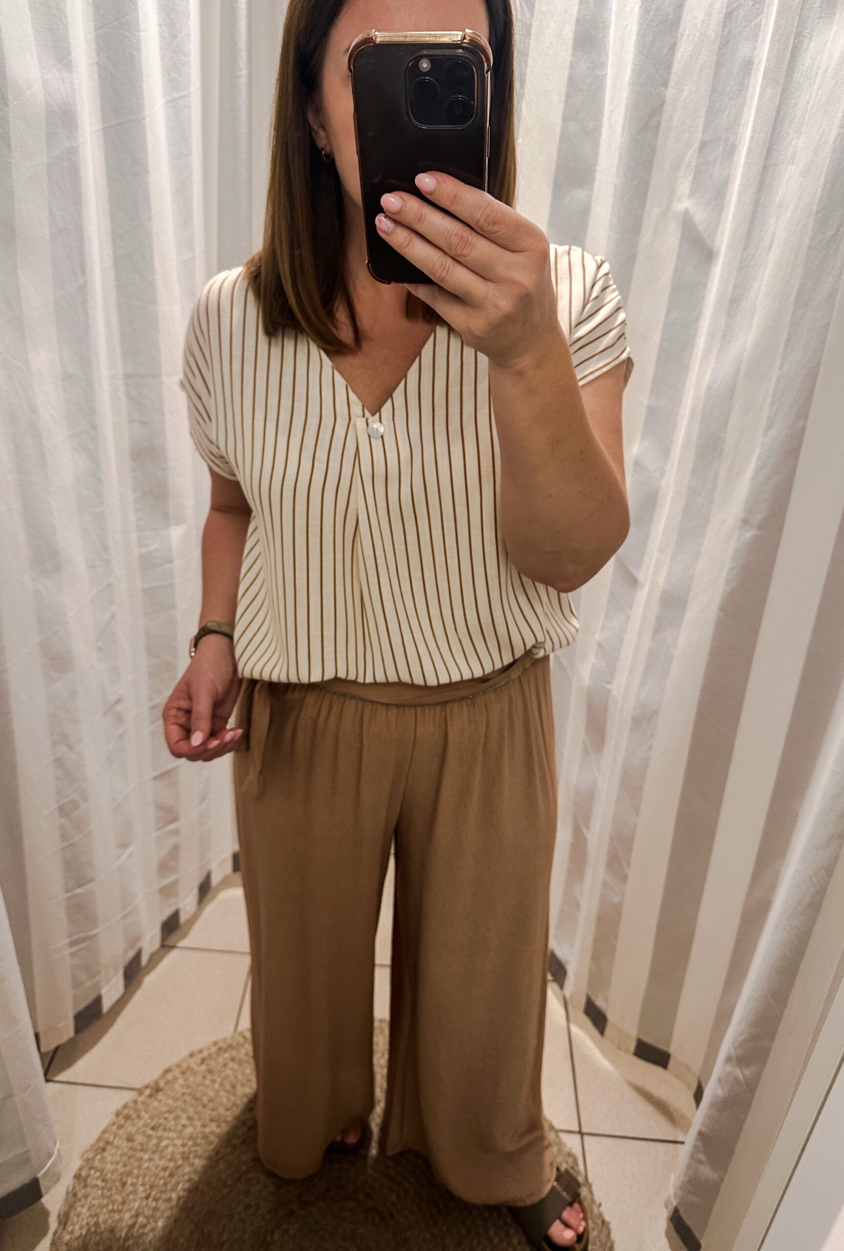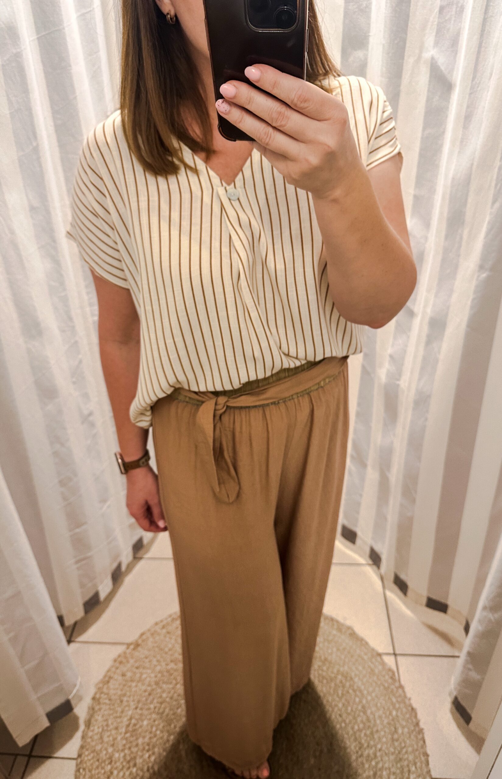 Stylowa bluzka damska w kremowym kolorze z delikatnymi, pionowymi paskami w odcieniu brązu. Wykonana z lekkiego i przewiewnego materiału, który zapewnia komfort noszenia przez cały dzień. Krótki rękaw oraz luźny krój sprawiają, że model doskonale sprawdzi się zarówno w codziennych stylizacjach, jak i w bardziej eleganckich zestawieniach. Dekolt w kształcie litery „V” z subtelnym guzikiem dodaje bluzce kobiecego charakteru i elegancji.