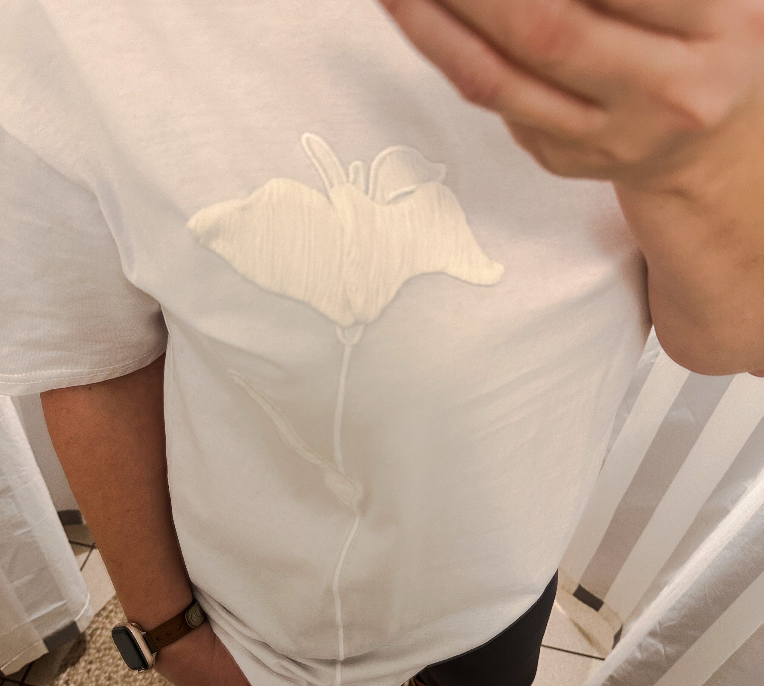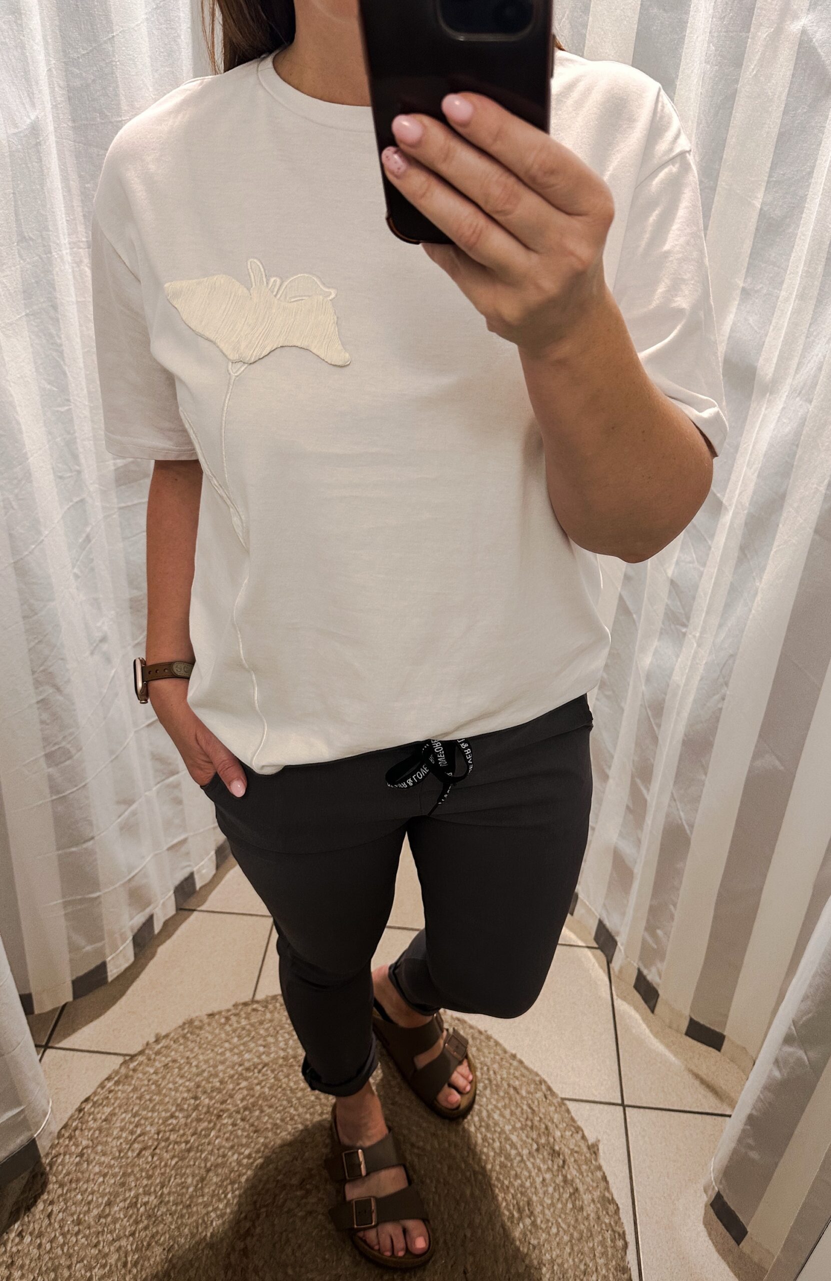 Ta bluzka to kwintesencja kobiecego stylu z lekką nutą nonszalancji. Jej klasyczny fason z krótkim rękawem świetnie sprawdzi się w codziennych zestawach, jak i bardziej formalnych okolicznościach – idealny dla kobiet, które chcą czuć się stylowo zawsze i wszędzie. Okrągły dekolt jest delikatnie wyprofilowany, tworząc harmonijną całość, która subtelnie podkreśla szyję i ramiona. Urok t-shirtu podnosi kwiatowa aplikacja dodająca charakteru oraz ponadczasowej elegancji.