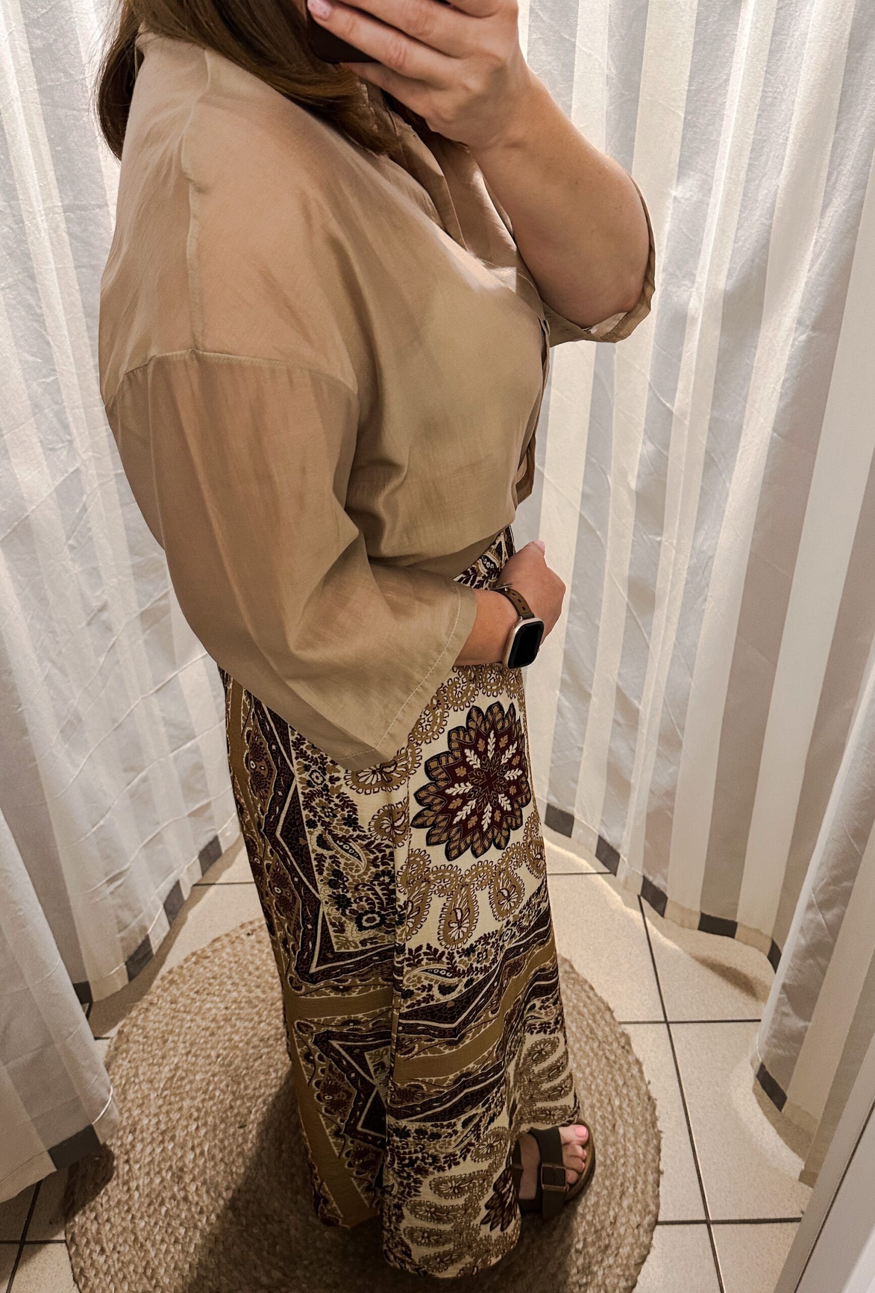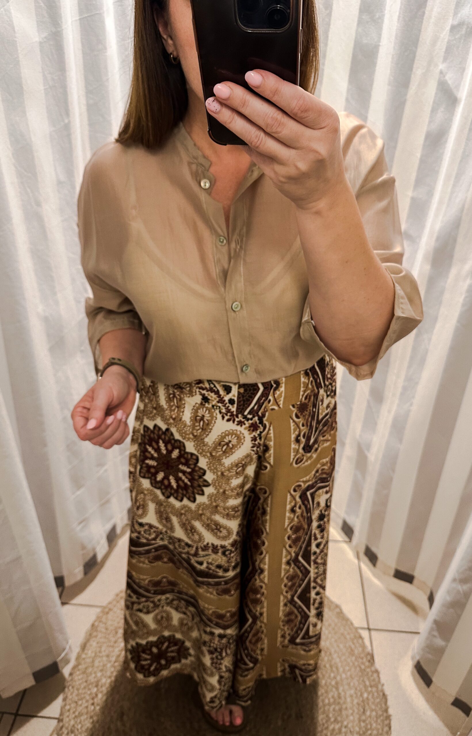 Stylowa i elegancka bluzka w beżu, wykonana z lekkiego, satynowego materiału, który dodaje jej subtelnego połysku. Luźny fason zapewnia komfort noszenia i pięknie podkreśla sylwetkę. Klasyczna stójka zamiast kołnierza nadaje jej nowoczesny i elegancki charakter. Rękawy krótkie, lekko puszczone, a cała bluzka wykończona jest eleganckim, klasycznym obszyciem bez ściągacza. To uniwersalny element garderoby, który świetnie sprawdzi się zarówno na co dzień, jak i na bardziej formalne okazje. Doskonale komponuje się z eleganckimi spodniami lub spódnicami, tworząc stylowy i kobiecy look.