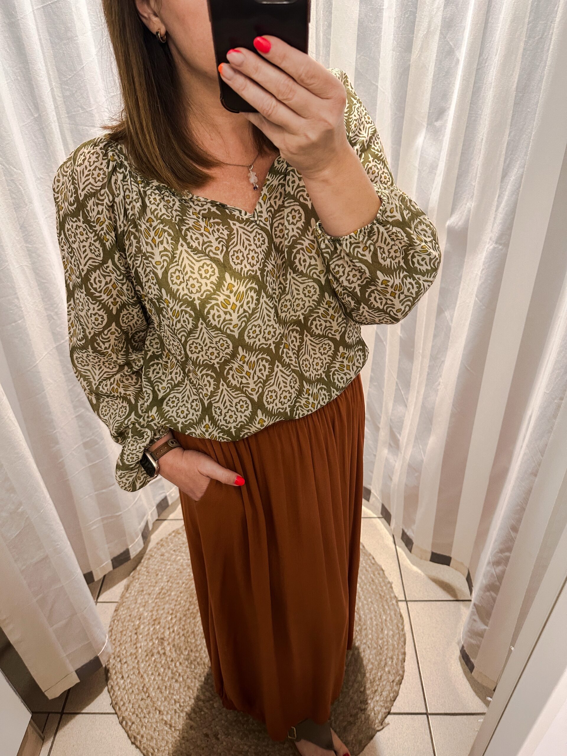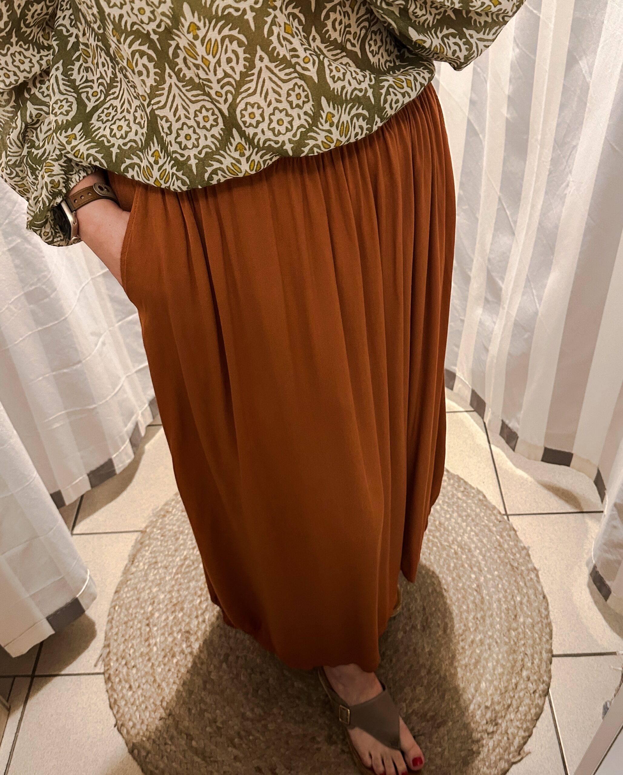 Wygoda, lekkość i styl w jednym. Ta spódnica midi z wiskozy to idealna baza do wielu stylizacji – od codziennych po bardziej eleganckie. Uszyta z miękkiej, przewiewnej tkaniny, która pięknie układa się na sylwetce i zapewnia komfort noszenia przez cały dzień. Spódnica posiada kieszenie oraz gumę w pasie. Luźny fason uzupełniono o subtelne gumki po bokach u dołu, które delikatnie zbierają materiał i tworzą efekt lekkiego marszczenia. Dzięki temu spódnica zyskuje nietuzinkowy detal i świetnie prezentuje się w ruchu. Wiskoza nadaje jej przyjemny, naturalny charakter i sprawia, że doskonale sprawdza się w cieplejsze dni.