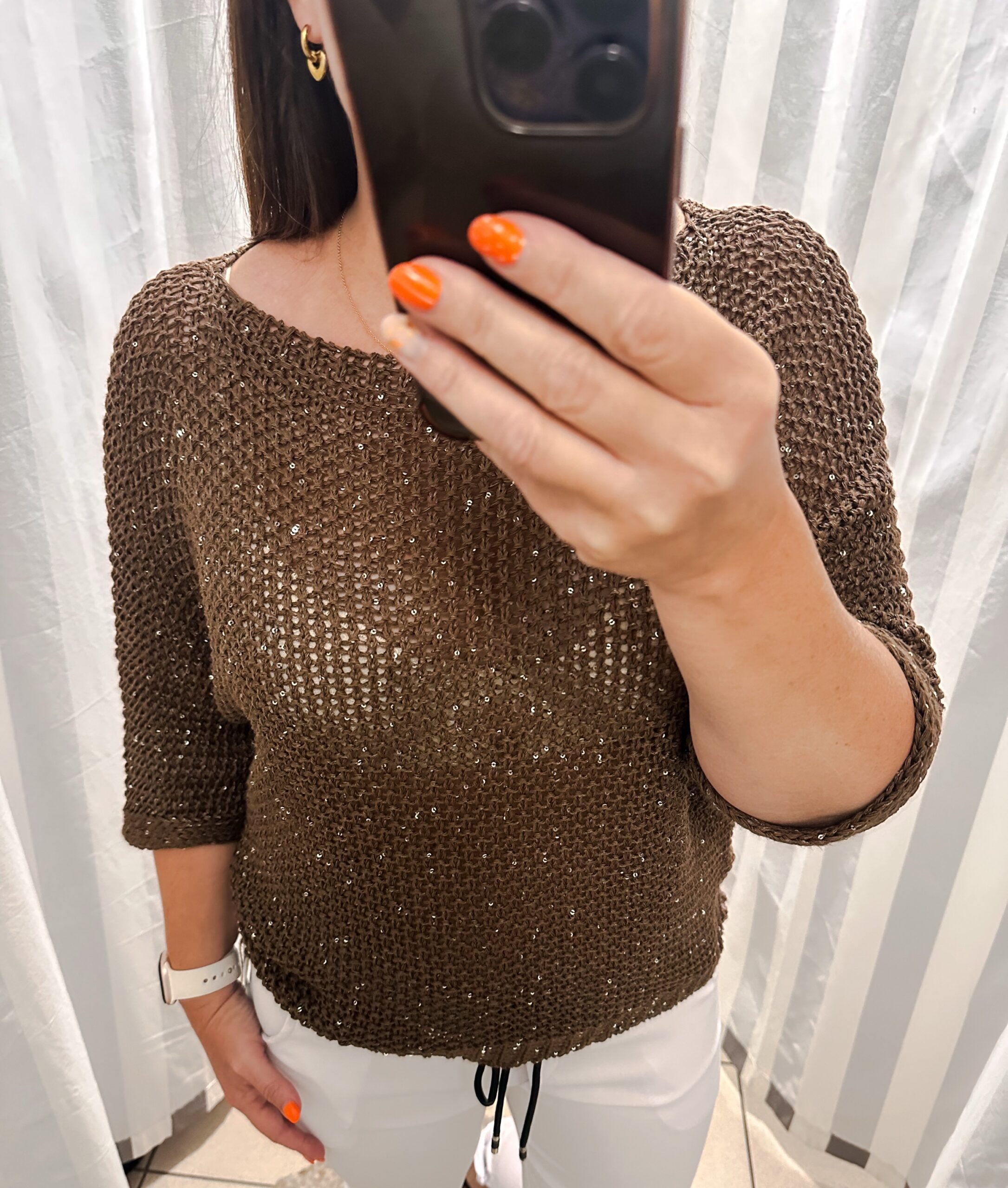 Dodaj elegancji i blasku swojej stylizacji dzięki temu wyjątkowemu swetrowi w odcieniu czekoladowego brązu. Wykonany z miękkiej, przewiewnej dzianiny o ażurowym splocie, ozdobionej subtelnymi cekinami, które pięknie odbijają światło. Sweter posiada rękaw 3/4 oraz luźniejszy krój zapewniający wygodę noszenia. Idealnie sprawdzi się zarówno na co dzień, jak i na wieczorne wyjścia – wystarczy dodać odpowiednie dodatki.