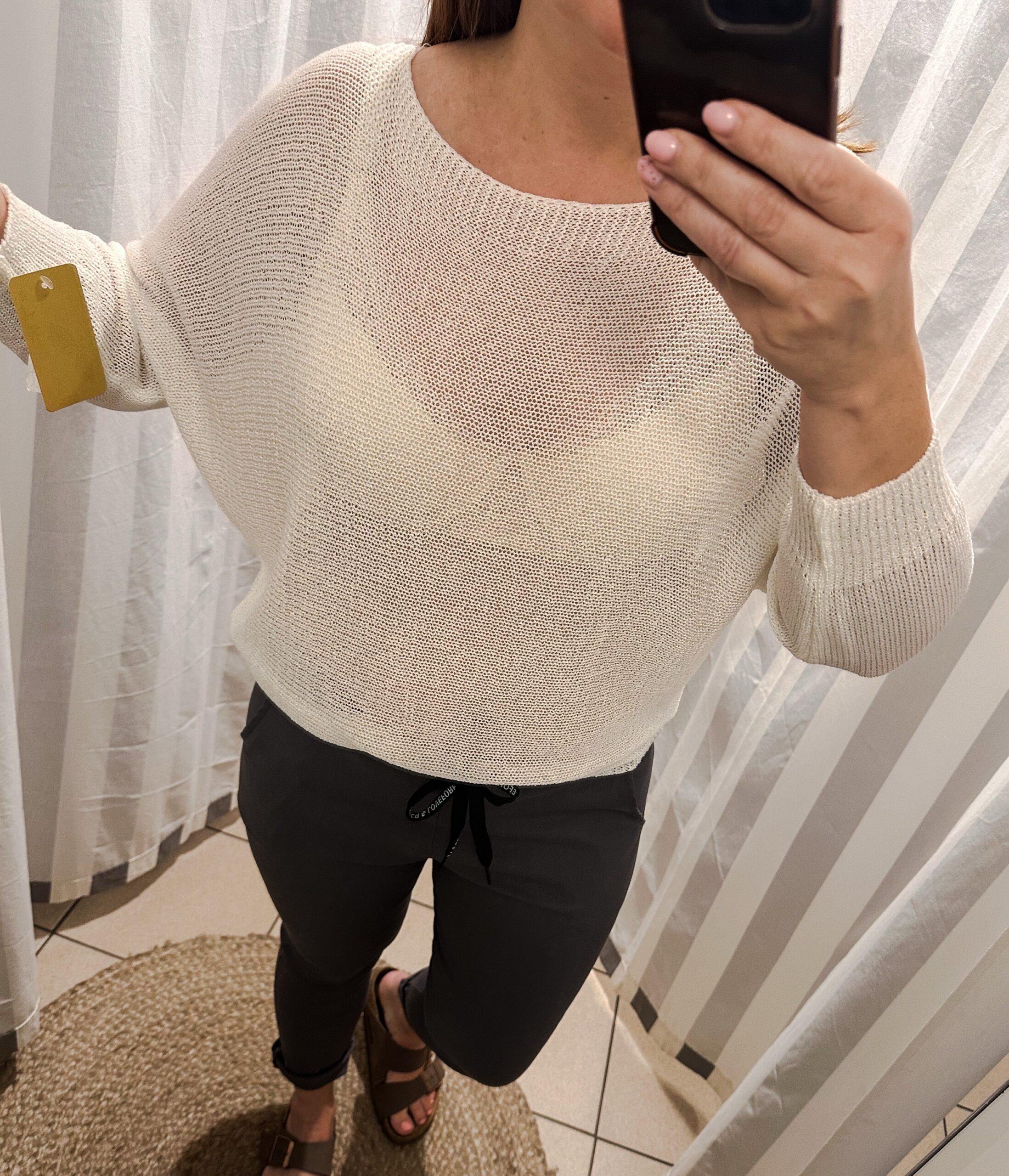 Ten lekki, ażurowy sweter w kolorze ecru to idealna propozycja na cieplejsze dni. Delikatna, przewiewna dzianina świetnie sprawdzi się w stylizacjach warstwowych – noś go na top lub koronkowy biustonosz, by uzyskać efekt casualowej elegancji. Luźny krój z obniżoną linią ramion i rękawem typu nietoperz. Łódkowy dekolt. Świetnie komponuje się z dopasowanymi spodniami, jeansami lub szortami. Idealny wybór na wiosnę, lato i wczesną jesień!