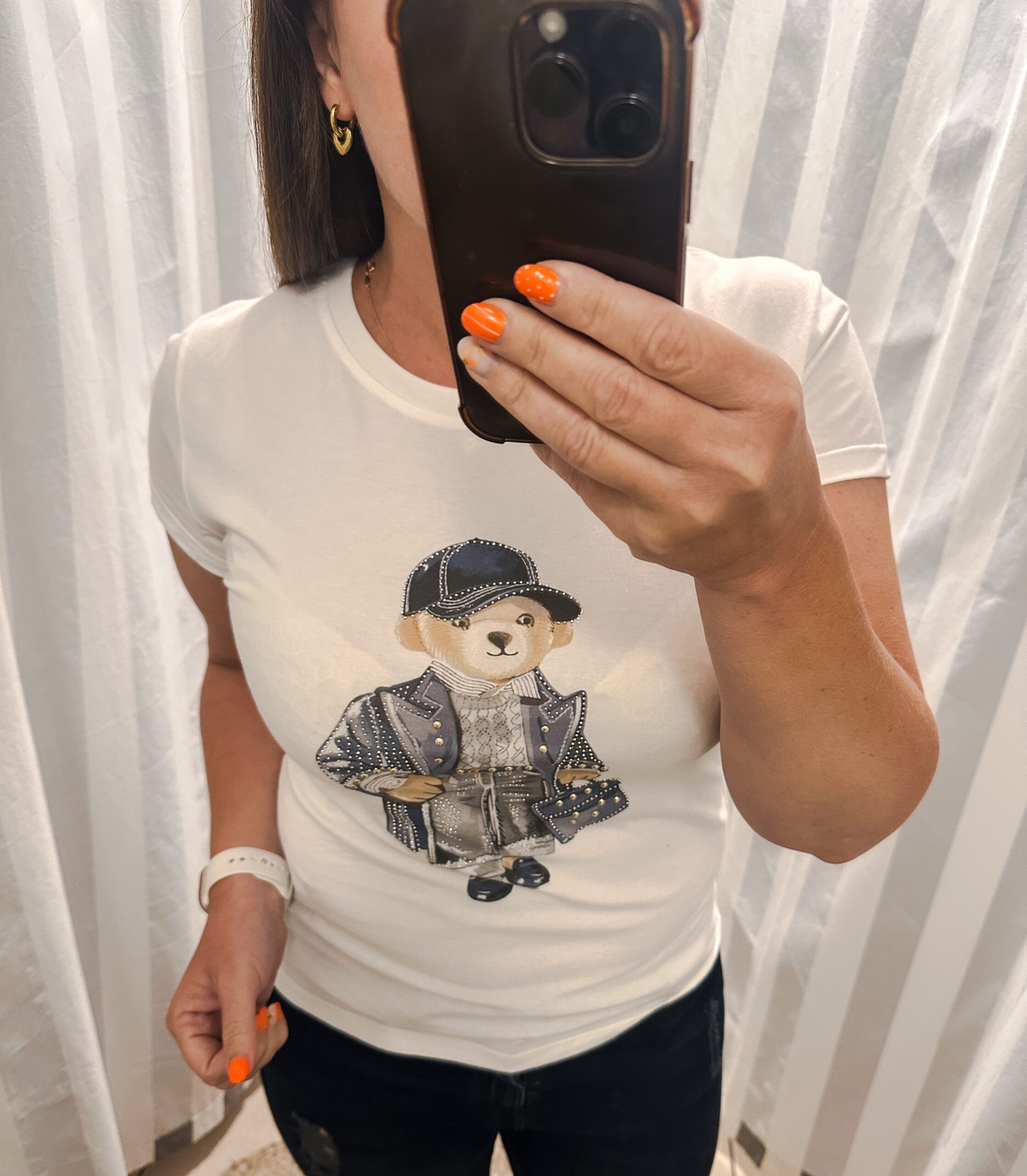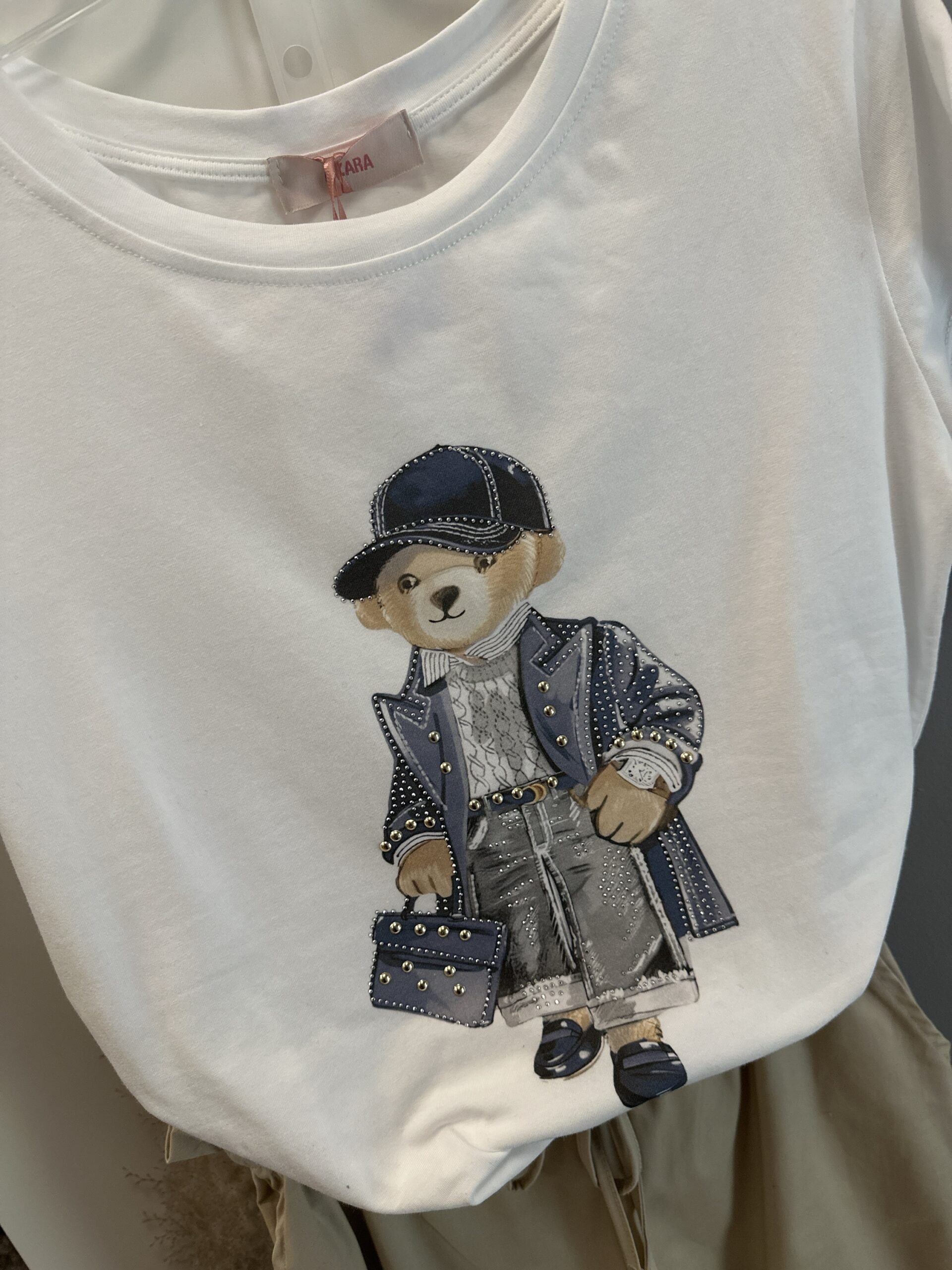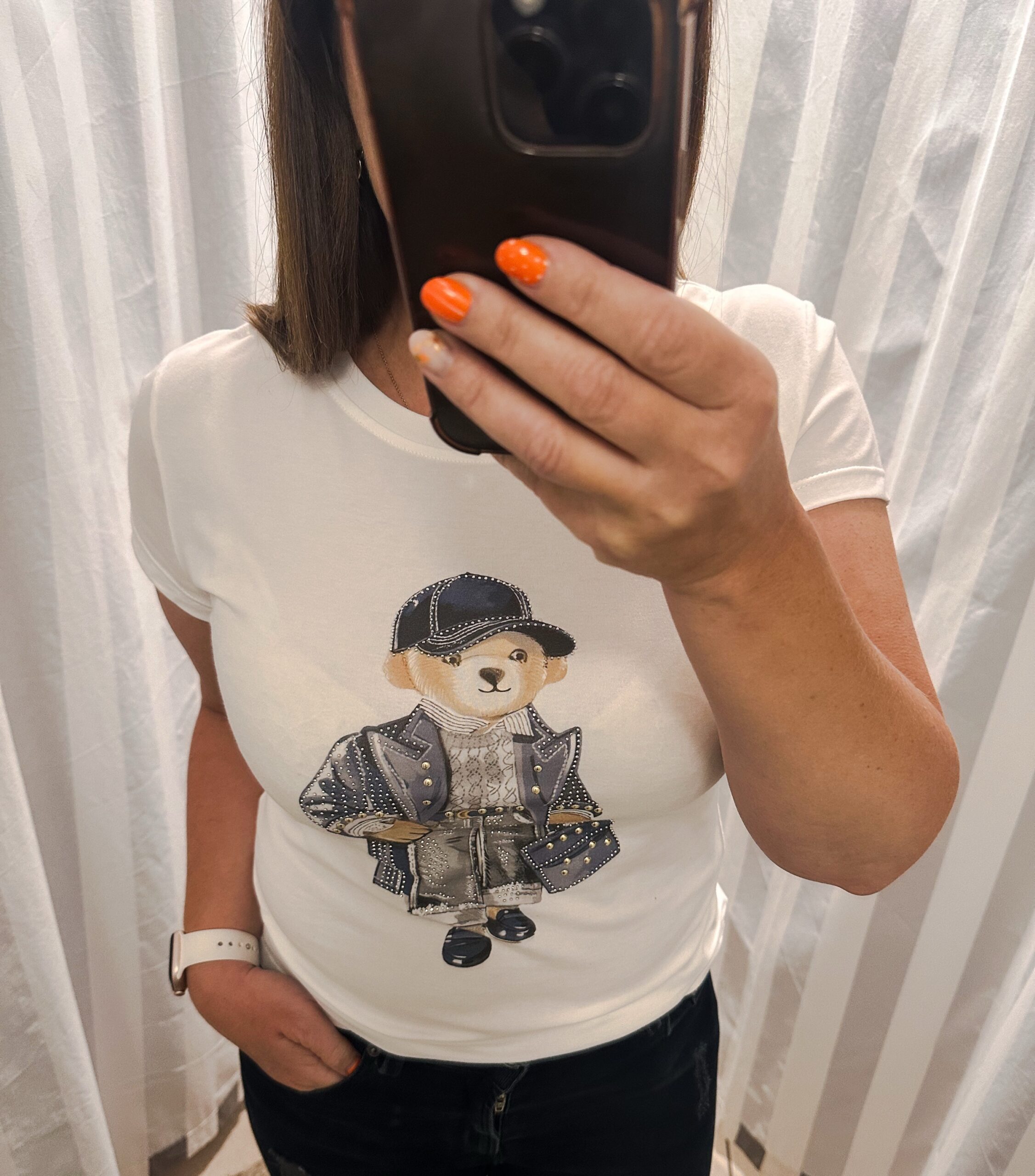T-shirt włoskiej marki Azara. Model z nadrukiem misia i naklejanymi cekinami i dżetami. Bawełna z dodatkiem elastanu. Dopasowany kroj z krótkim rękawem. Prosty fason. Okrągły dekolt. Idealny do jeansów, szortów czy pod marynarkę. Dodaj odrobinę humoru i stylu do swojej garderoby – wybierz t-shirt, który przyciąga spojrzenia!