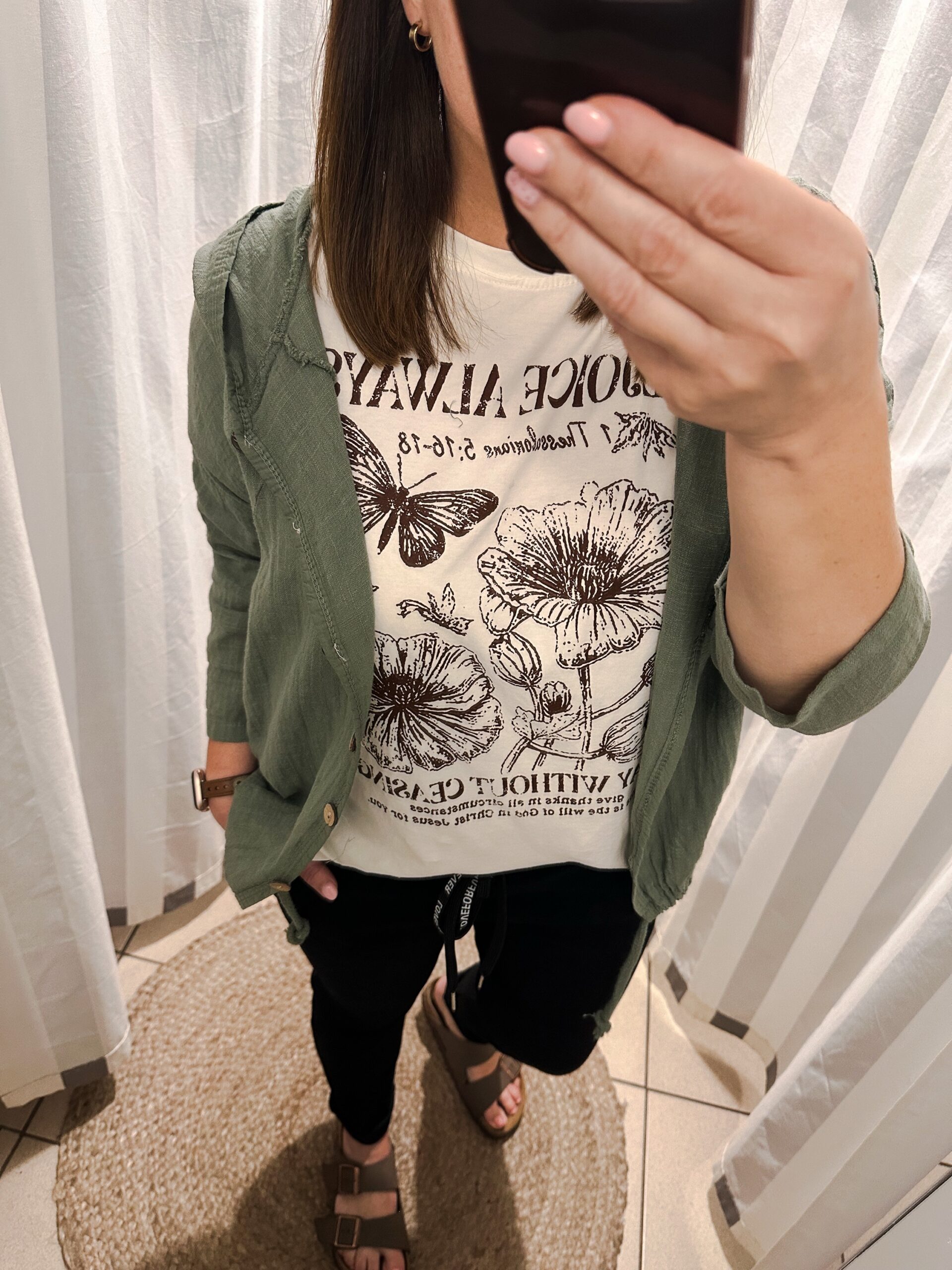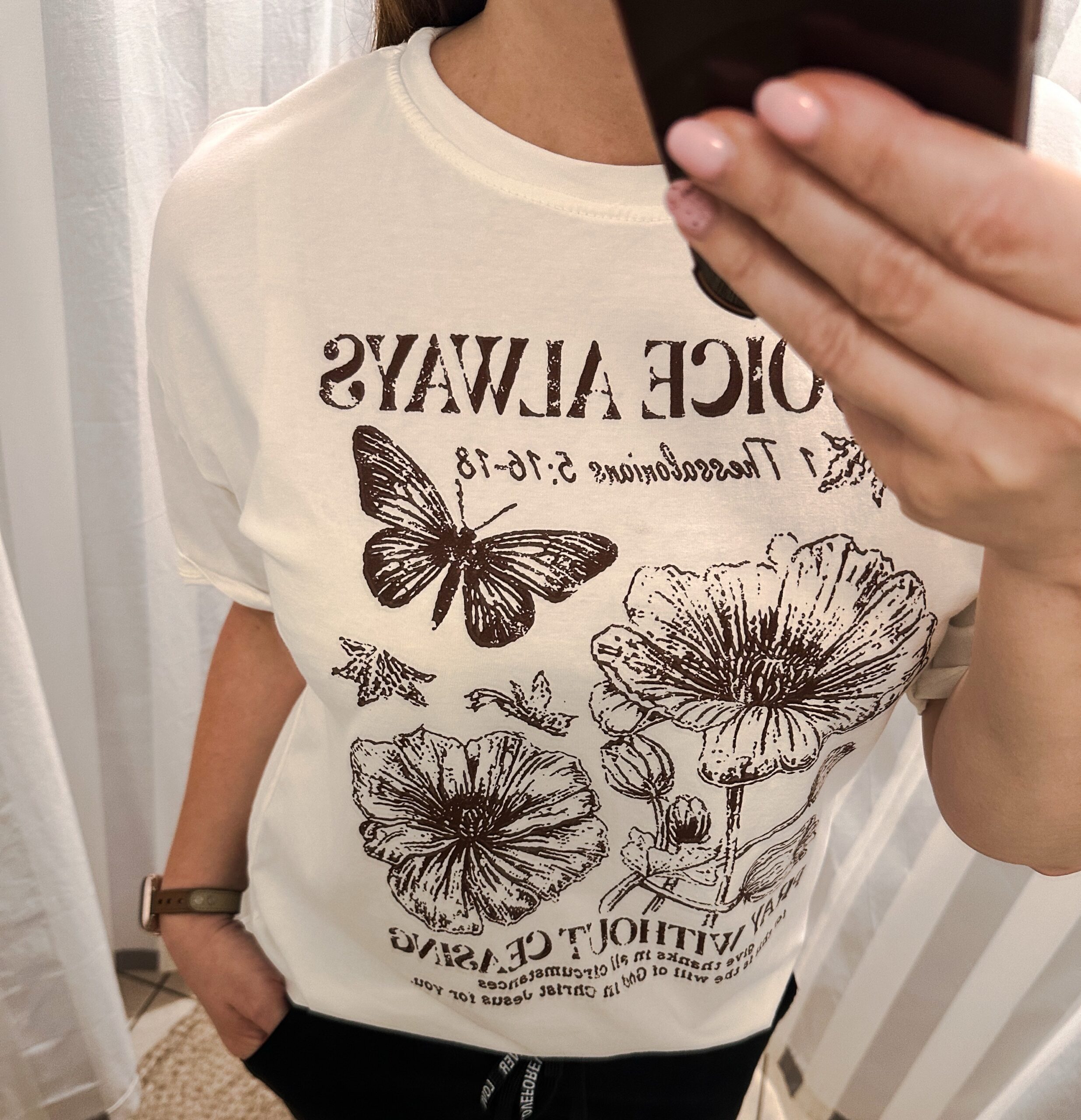 Bawełniany t-shirt o klasycznym kroju. Okrągły dekolt, pod szyję. Efektowny nadruk z przodu. Świetna baza wielu stylizacji.